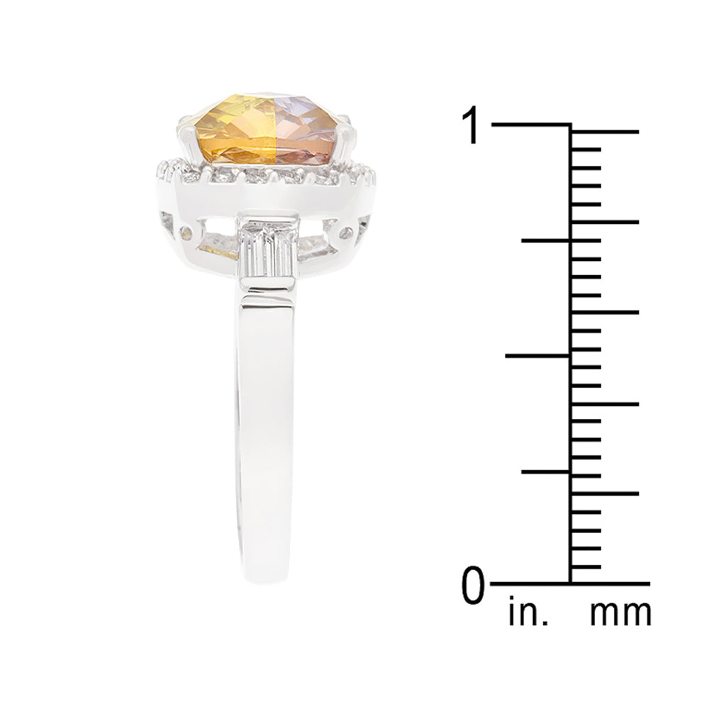 Genuine Rhodium Plated Cocktail Ring with Bar Set Baguettes and Prong Set Cushion Cut Multicolor 4ct Cubic Zirconia bordered by Pave Round Cut Clear Cubic Zirconia Polished into a Lustrous Silvertone Finish. Elle's Ring is a fun cocktail style ring to wear out on the town. Its 4 carat multicolor cushion cut center stone radiates while the Pave cubic zirconia clusters brighten and make this ring pop. Genuine Rhodium Plating is achieved using an electroplating process that coats the item with heavy layers of rhodium a close cousin of platinum that costs three times as much which gives our jewelry a platinum luster.