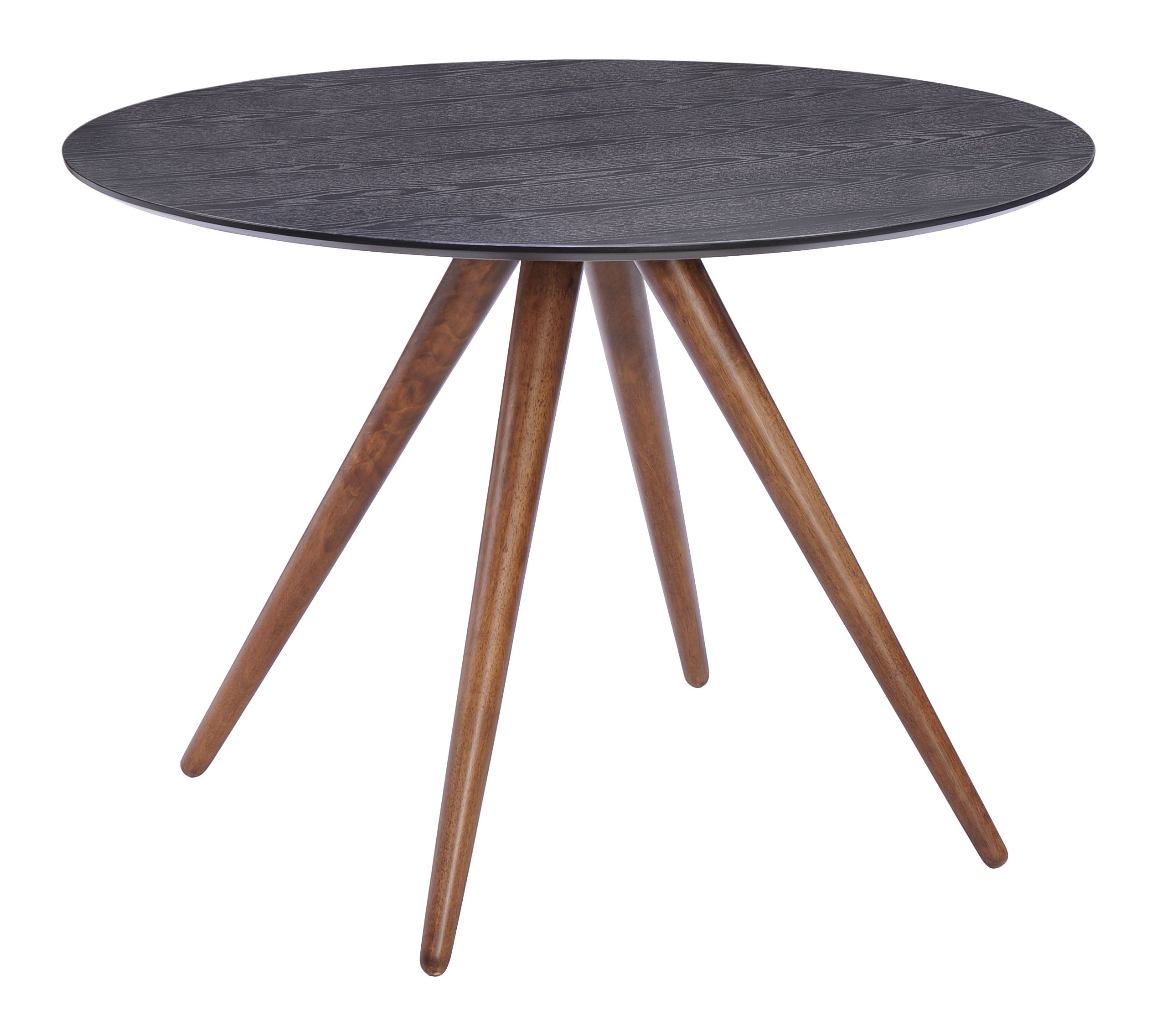 Splayed legs and round top give the Grapeland Heights Table a mod feel. Has a handsome walnut color finish in the legs and matte black with wood grain for the top. It's a lovely foil for mid-century chairs.
