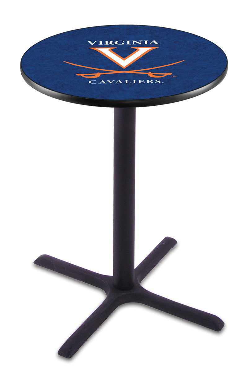 Made for the ultimate sports fan, impress your buddies with this knockout from Holland Bar Stool. This L211 Virginia table with cross base provides a commercial quality piece to for your Man Cave. You can't find a higher quality logo table on the market. The sublimated, full color, laminate top it attached with a VOC free, environmentally friendly, hot-melt adhesive. The plating grade steel used to build the frame ensures it will withstand the abuse of the rowdiest of friends for years to come. The structure is powder-coated black wrinkle to ensure a rich, sleek, long lasting finish. If you're finishing your bar or game room, do it right with a table from Holland Bar Stool. Warranty: 1 year frame warranty.