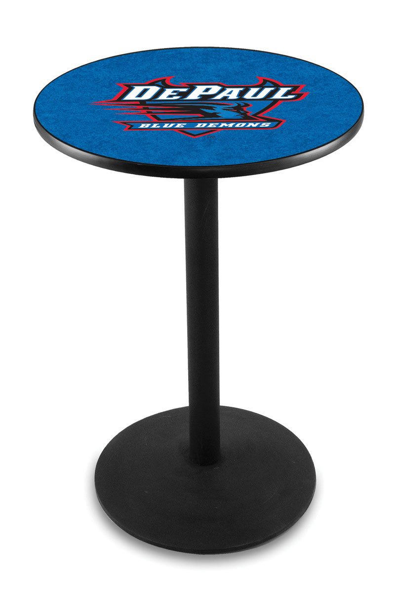 Made for the ultimate sports fan, impress your buddies with this knockout from Holland Bar Stool. This L214 DePaul table with round base provides a commercial quality piece to for your Man Cave. You can't find a higher quality logo table on the market. The sublimated, full color, laminate top it attached with a VOC free, environmentally friendly, hot-melt adhesive. The plating grade steel used to build the frame ensures it will withstand the abuse of the rowdiest of friends for years to come. The structure is powder-coated black wrinkle to ensure a rich, sleek, long lasting finish. If you're finishing your bar or game room, do it right with a table from Holland Bar Stool.