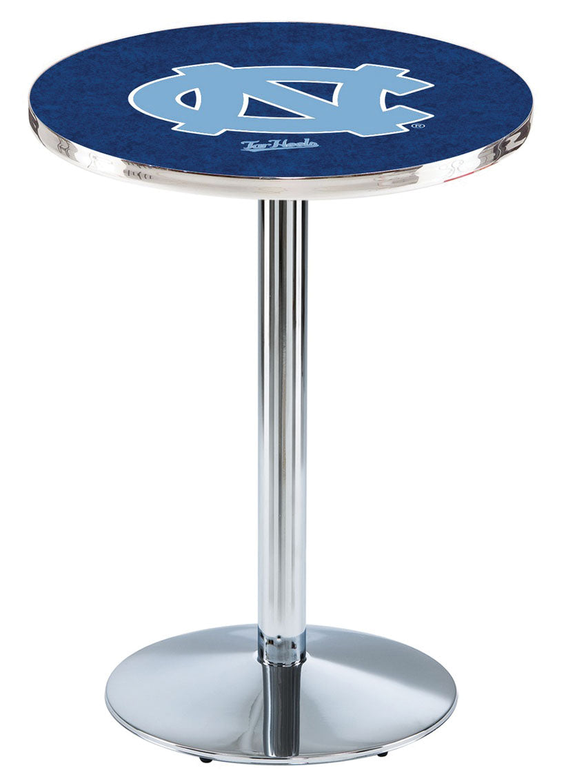 Made for the ultimate sports fan, impress your buddies with this knockout from Holland Bar Stool. This L214 North Carolina table with round base provides a commercial quality piece to for your Man Cave. You can't find a higher quality logo table on the market. The sublimated, full color, laminate top it attached with a VOC free, environmentally friendly, hot-melt adhesive. The plating grade steel used to build the frame ensures it will withstand the abuse of the rowdiest of friends for years to come. The structure is triple chrome plated to ensure a rich, sleek, long lasting finish. If you're finishing your bar or game room, do it right with a table from Holland Bar Stool.