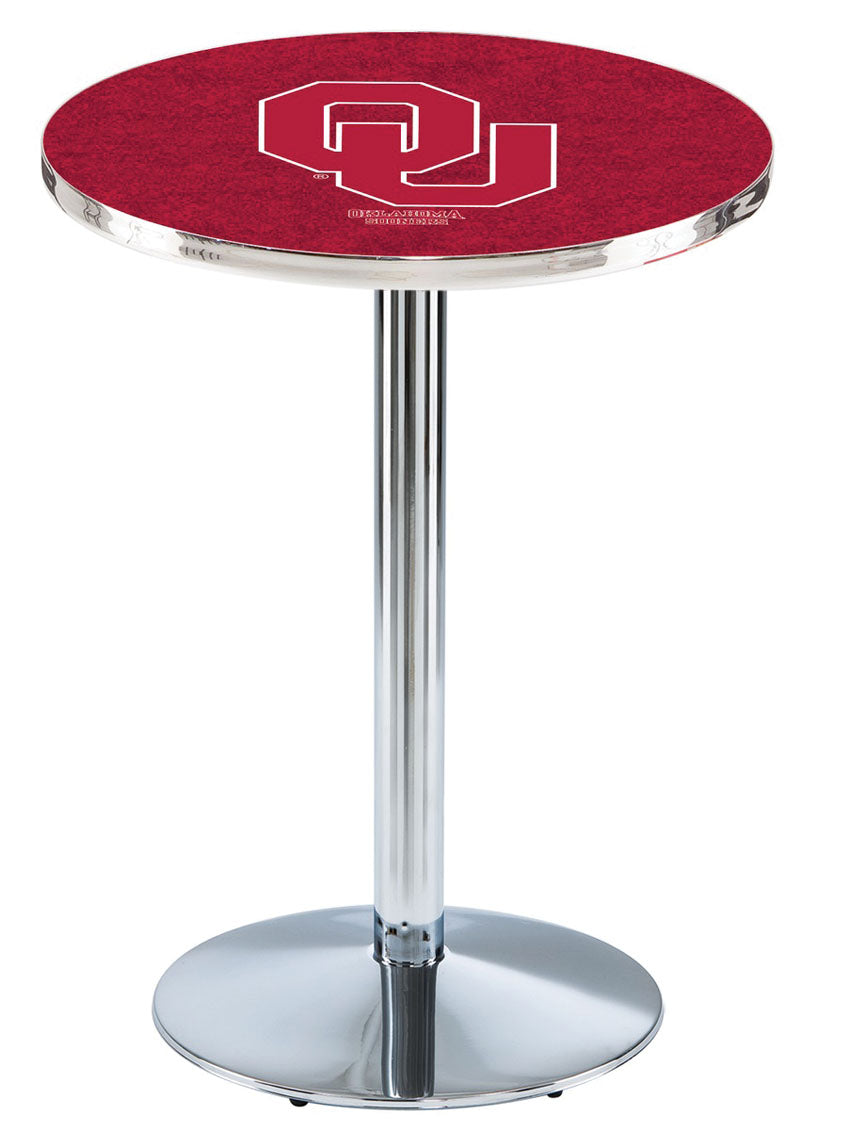 Made for the ultimate sports fan, impress your buddies with this knockout from Holland Bar Stool. This L214 Oklahoma table with round base provides a commercial quality piece to for your Man Cave. You can't find a higher quality logo table on the market. The sublimated, full color, laminate top it attached with a VOC free, environmentally friendly, hot-melt adhesive. The plating grade steel used to build the frame ensures it will withstand the abuse of the rowdiest of friends for years to come. The structure is triple chrome plated to ensure a rich, sleek, long lasting finish. If you're finishing your bar or game room, do it right with a table from Holland Bar Stool.